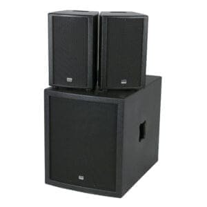 Deze set bestaat uit één subwoofer met een 15″ woofer en twee satelliet luidsprekers met 8″ woofers en 1″ hoogdrivers. In de subwoofer zit een versterker ingebouwd. Je hebt dus geen losse versterker bij deze set nodig en kunt met een simpele tulpkabel deze set aansluiten op een mengpaneel of op zelfs direct op een MP3-speler of een iPod.