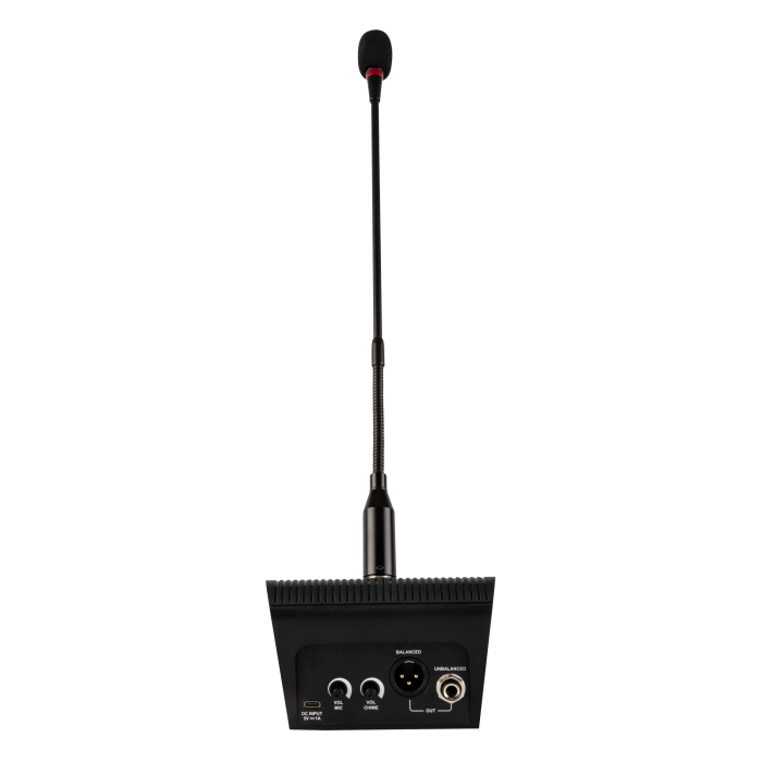 De microfoon is gemonteerd op een flexibele zwanenhals, wat een ongekende mate van positioneringsvrijheid biedt. Gebruikers kunnen de microfoon moeiteloos aanpassen aan hun voorkeurshouding, wat zorgt voor optimaal comfort en een constante spreekpositie. Deze ergonomische eigenschap vermindert vermoeidheid bij langdurig gebruik en garandeert een consistente geluidskwaliteit, ongeacht de lengte of aard van de aankondiging. De zwanenhals is bovendien stevig genoeg om zijn positie te behouden, zelfs na veelvuldig aanpassen.