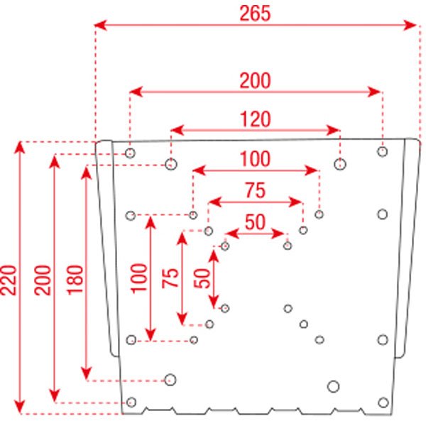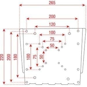Deze beugel heeft een bevestigingsplaat met afmetingen van 25,3 bij 22,2 centimeter en is voorzien van diverse schroefgaten voor de bevestiging van het scherm aan de beugel en voor de bevestiging van de beugel aan de muur of wand.