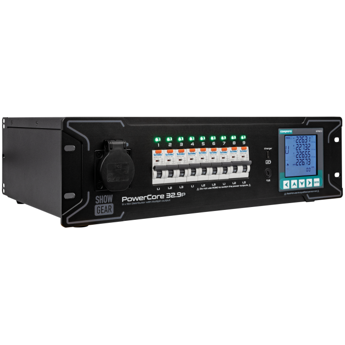 De Showgear PowerCore 32.9p is een geavanceerde stroomdistributie-eenheid die is ontworpen om een veilige, betrouwbare en efficiënte stroomtoevoer te garanderen voor al uw professionele apparatuur. Dit apparaat combineert robuuste constructie met intelligente functies, waardoor het een onmisbare schakel is in elke veeleisende audiovisuele, podium- of installatieomgeving.