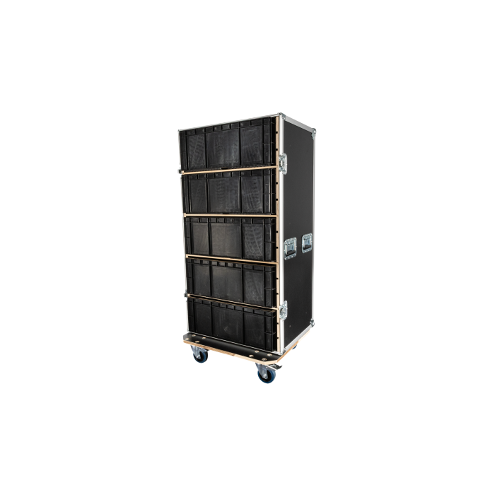 Het meest in het oog springende kenmerk is de filosofie van flexibele opbergruimte, een bewuste keuze boven de beperkingen van vaste compartimenten. Dit betekent dat de gebruiker de vrijheid heeft om de interne configuratie aan te passen aan de specifieke lading van dat moment, in plaats van zich te moeten conformeren aan vooraf bepaalde indelingen. De kern van deze flexibiliteit wordt gevormd door de vijf robuuste, zwarte kratten die naadloos geïntegreerd zijn in het systeem. Deze kratten, ondersteund door vier solide interne planken, creëren een modulair systeem dat ongekende mogelijkheden biedt voor het organiseren van items. Of het nu gaat om delicate microfoons, omvangrijke kabels, reserveonderdelen of handgereedschap; alles vindt zijn plek. Het grote voordeel van deze kratten is hun eenvoudige verwijderbaarheid. Dit faciliteert niet alleen een razendsnelle toegang tot de inhoud, maar optimaliseert ook het inpakproces aanzienlijk. Geen gedoe meer met het onhandig reiken in de diepten van een kast; de kratten kunnen eenvoudig worden uitgenomen, gevuld en weer teruggeplaatst.
