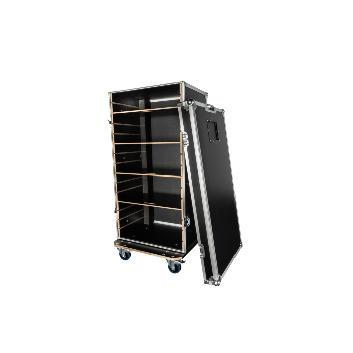 Gebruikerscomfort is een andere pijler van het ontwerp. De vijf ergonomisch gevormde handgrepen zijn strategisch geplaatst om een comfortabele en veilige hantering te garanderen, zelfs wanneer de case volledig beladen is. Deze handgrepen zijn niet alleen functioneel, maar ook ontworpen om langdurig gebruik te weerstaan zonder tekenen van slijtage. De verplaatsbaarheid is verder geoptimaliseerd door de toevoeging van vier soepel rollende zwenkwielen. Elk wiel is voorzien van een betrouwbare rem, wat niet alleen een moeiteloze verplaatsing over verschillende ondergronden mogelijk maakt, maar ook een veilige en stabiele positionering garandeert zodra de flightcase op zijn plaats staat. Dit voorkomt ongewenst verschuiven en draagt bij aan de veiligheid op de werkplek.