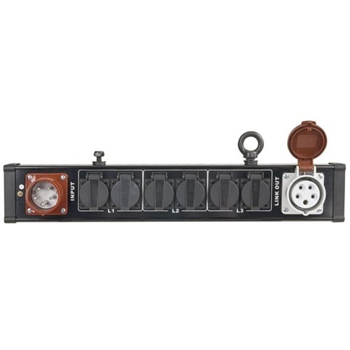 Deze compacte Breakout bar van Showtec heeft een 5-polige CEE 16A connector en dient op een 3-fase 380 Volt krachtstroomkabel te worden aangesloten. De bar heeft zes Schuko uitgangen en een krachtstroom doorlus uitgang. Op de Schuko uitgangen kunnen lichteffecten, lichtarmaturen en/of andere apparaten worden aangesloten. De bar beschikt over een schroefdraad waaraan een G-haak of clamp te monteren is en is voorzien van een safety-oog. Zowel de schroefdraad als het safety-oog zitten op een glijprofiel en kunnen verschoven worden.