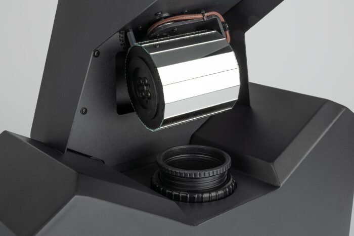 Het kleurenwiel is een cruciaal onderdeel van de creatieve mogelijkheden van de Demon. Het bevat 9 vaste, levendige kleuren, aangevuld met een “open” positie voor puur wit licht. Een bijzonder geavanceerde softwarefunctie maakt echter gesplitste kleureffecten mogelijk, waardoor de Demon in staat is om tot maar liefst 16 unieke kleurencombinaties te genereren. Dit vergroot de pallet aanzienlijk en biedt ontwerpers de mogelijkheid om subtiele kleurovergangen of dramatische contrasten te creëren. Het gobo-wiel draagt verder bij aan de visuele veelzijdigheid met 7 diverse gobo’s, inclusief een “open” optie. De roterende gobo-functionaliteit is een sleutelfunctie, waarmee dynamische patronen en texturen worden gecreëerd die kunnen bewegen, roteren en morphing effecten kunnen uitvoeren, wat een extra dimensie toevoegt aan de projecties.