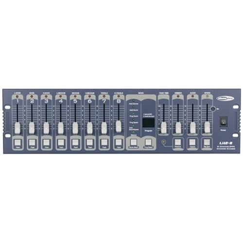 Deze controller heeft maar liefst 48 ingebouwde programma’s en biedt de mogelijkheid om zelf een programma te maken. De programma’s kunnen met een bepaalde snelheid of op de maat van de muziek afgespeeld worden. De acht kanaalfaders met flash buttons en de master fader maken het mogelijk de parren ‘live’ te bedienen. De controller heeft een DMX uitgang en kan worden aangesloten op een dimmer of DMX T-bar.