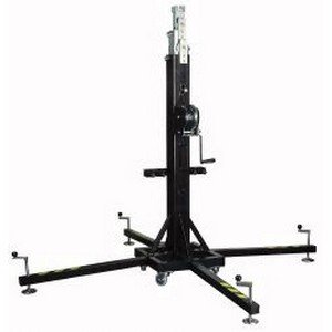 Showtec Elevator Towers are manufactured to lift loads vertically.The telescopic system is composed of three steel profiles handled through a steel cable of high resistance to the traction, guided by pulleys provided by self-lubricant ball bearings. The entire mobile system is fixed via security catches, essential during the tower effort. Automatic break winch according to the standard VBG 8/10.93 and certificate TV 9591009. The leg ends are adjustable in height. At the end of the legs are stabilizers, in order to make it easy to install the tower on every kind of ground. It also has a water level, for vertical adjustment. The entire set is covered by electrolytic zinc in order to protect it against corrosion and oxidation.