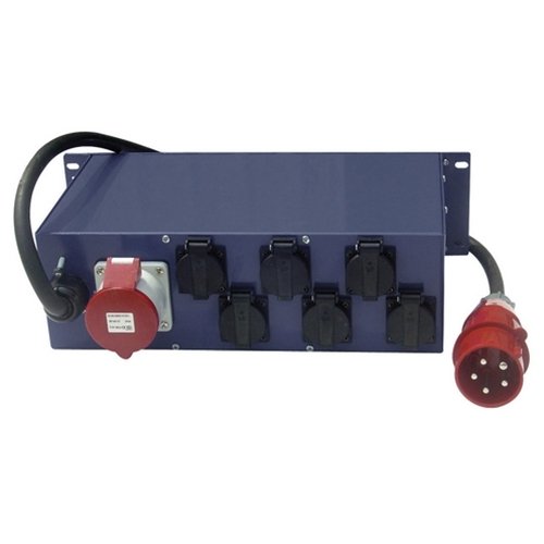Deze 19" krachtstroomverdeler heeft één 5-pins CEE 32A ingang aan een anderhalve meter lange kabel, zes Schuko uitgangen op de achterzijde, twee 5-pins CEE 16A uitgangen op de voorzijde en één 5-pins CEE 32A doorlus uitgang op de achterzijde. Op de ingang dient een 3-fase 380 Volt krachtstroomkabel te worden aangesloten en op de uitgangen kan apparatuur met een totaalvermogen van maximaal 22.080 Watt worden aangesloten. Mocht de aangesloten apparatuur te veel vermogen vragen, dan schakelt de circuitbreaker de apparatuur automatisch uit. Na het weghalen of veranderen van één of meerdere apparaten kan de stroom weer eenvoudig worden ingeschakeld, zonder dat er een zekering vervangen hoeft te worden.